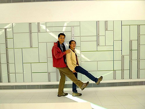 園區一直廣播大佳公園藍色公路的訊息,我們打定主意下次才去大佳園區,一時之間竟然不知到哪兒比較好,於是又走去圓山園區與家人會合,此時他們正在名人館與鄧麗君約會,我們利用等待他們的空檔,岔出今天走過無數次的美術館通道外"玻璃長廊",喜歡這裡,人少,又有設計感。