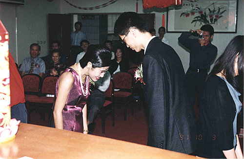 夫妻交拜:後面拿相機的是老弟,照片左方觀禮的是我們的親友團。