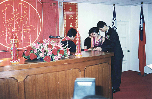 首先拿出身分證、印章辦理登記:岳父岳母是最早到達的來賓,所以主婚人順便當我們的證婚人。