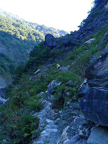 行前看別人的照片,非常擔心懼高的我會不會走到半路,兩腳發軟,不敢走下去,那可連累大了;實際走在這裡,路徑頗寬,旁邊又有拉繩,靠內側走就好,比想像中安全得多;落石崩塌需要高繞的路線,也架設地非常安全好走。(這幾張照片不能讓老爸看見,他會擔心到失眠的。)