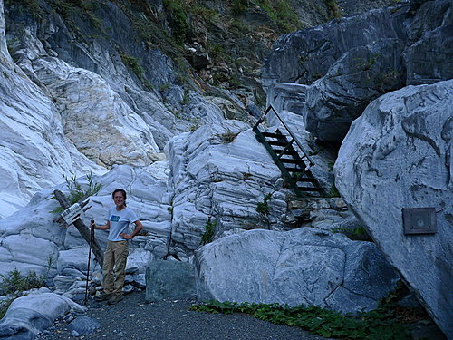 "沿著河床走,可以欣賞白色大理石千變萬化的色澤紋路,感受河水的清涼,之後會接回步道...",果然漂亮,這時真希望太陽公公靠過來一點。