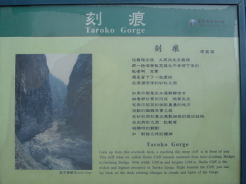 回想起2007年曾在九曲洞附近的觀景台上仰望著立霧溪切出那令人屏息的百萬年刻痕~~"錐麓大斷崖",咀嚼著解說牌上的這首詩,那時怎麼也想不到,有一天,我居然可以走在那和天一樣高的斷崖上,細數先人的辛酸血淚。