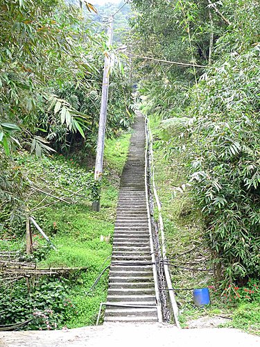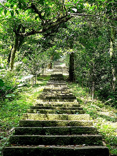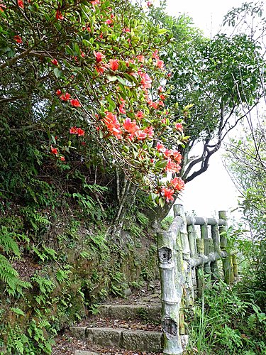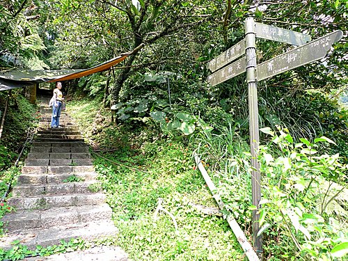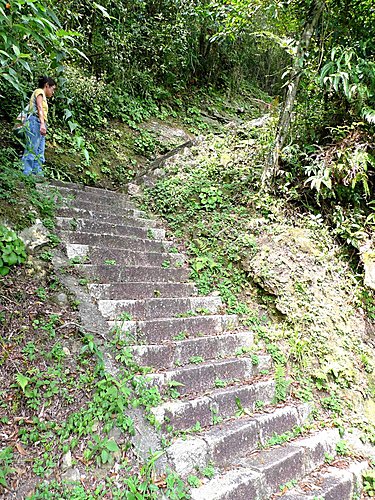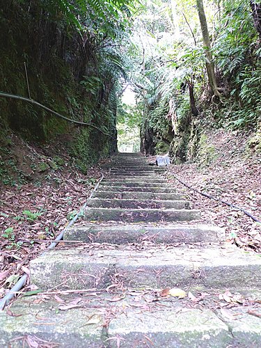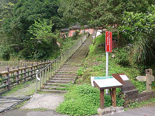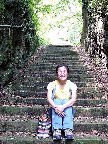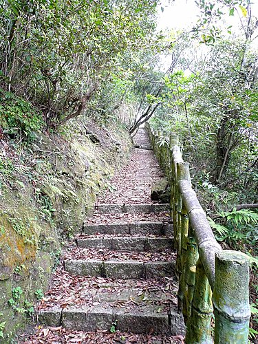 我們由二坑口聚落登山口起登,全程已舖設花崗石石階,非常好走,但是綿延不絕的階梯步道,顯得有些單調,就當作走表參道安慰自己唄!可是階梯的坡度頗陡,走沒多久,老婆直說:喘到心臟都快跳出來了!