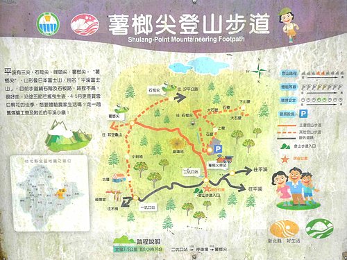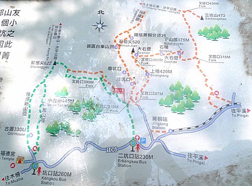 今天從早上8:30停好車之後,就必須一直走路散步直到天燈結束,所以並沒有爬山的打算。但是走到二坑聚落的菁桐古道入口,指標牌顯示往"薯榔尖"與"石筍尖"一公里左右,看看導覽圖,考慮了一下,算了,保留體力,下次再來!