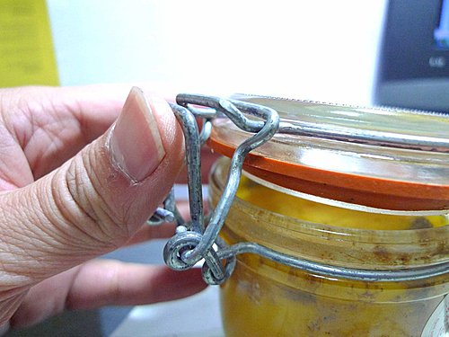 3.拿開玻璃蓋和橡皮墊,整罐放入滾水中讓油脂溶化後,將油脂倒出,即可取出完整的鵝肝醬