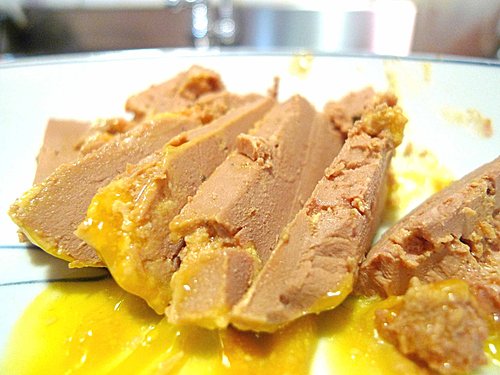4.刀子置於熱水中加溫,將鵝肝醬切成薄片,切一刀就要加溫一次,才不會沾黏,雖然如此,還是切的支離破碎(懶惰的我們懶得用熱鐵絲了!)