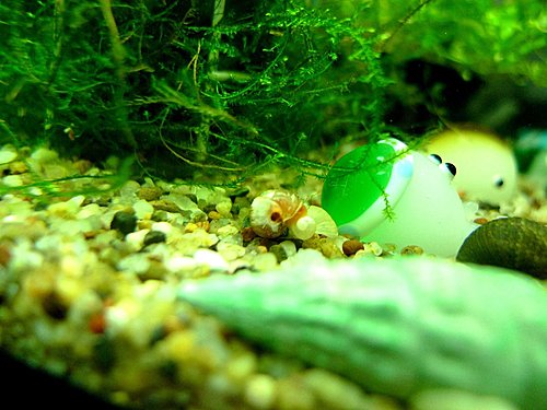 魚缸內環境穩定後,"黑殼蝦"與"蘋果螺"也開始四處覓食,眼尖的融融發現到一隻抱蛋的黑殼蝦,可惜之後就一直躲起來,無法拍照紀錄,只有請小朋友注意觀察黑殼蝦媽媽的蹤跡,並且注意小蝦誕生的日子。
