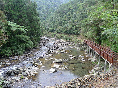 新造的木橋沿溪邊而建,也許這一段路基因溪水的沖刷而流失;橋上可見右側山壁的潺潺流水。