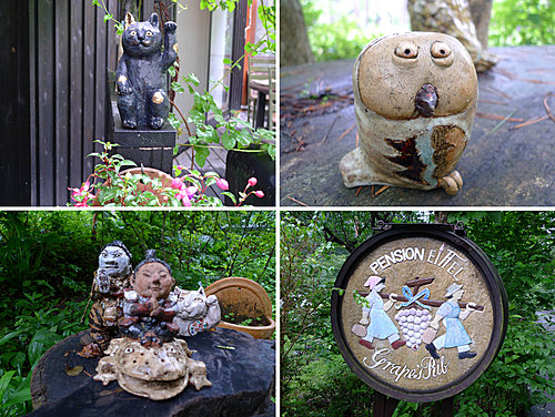 第二天一早,從鳥鳴聲和麵包香中醒來之後,我們就到民宿附近散散步,這一帶規劃為民宿村,夾道種著一大片的赤松,下過微雨的清晨,空氣顯得分外清新,森林的氣氛,庭園的造景都很美,我們逛得不亦樂乎。民宿旁邊是"陶人形"藝品店,還沒營業,我們好奇地在它的庭院中欣賞著栩栩如生的陶藝作品,差一點錯過約好的早餐時間。。