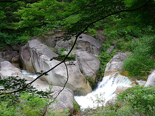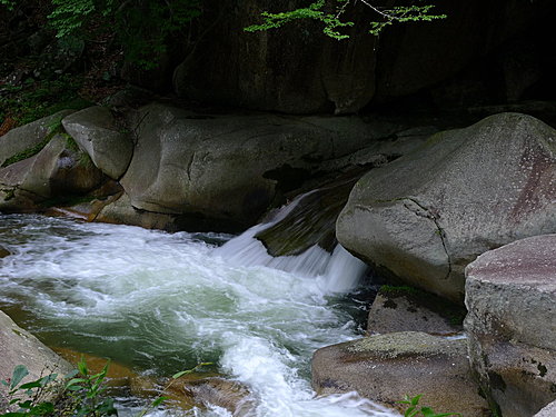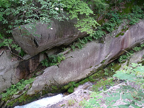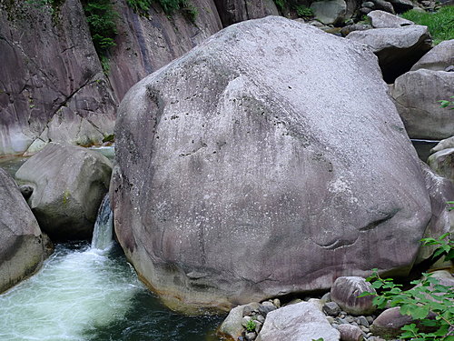 甌穴地形:照片中左邊兩塊石頭,中間有白色急流的就是。因為溪水、瀑布挾帶著小石頭急速流下,將堅硬的花崗石沖激切開而形成。