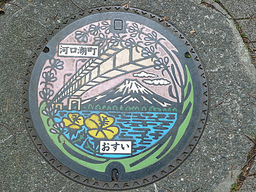 開車到河口湖大橋北口的"產屋之崎",據說在春天可以欣賞滿開的櫻花與湖面的逆富士山美景。這裡的圓孔蓋圖案很有本地的特色。