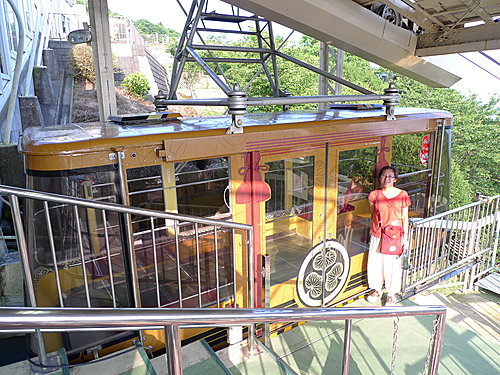 拜訪寺廟和城堡,對於當地的歷史背景、風俗民情和建築特色最好有一些基本了解較能看出興味,但是我們兩個日本文盲什麼背景知識也沒有,說明簡介又看不懂,所以以前到日本都略過這些古蹟。只是今天的行程到目前為止實在乏善可陳,步道繼續走下去看到"久能山東照宮ropeway"的指標,正好3:30的纜車快開了,猶豫了一下,還是趕緊買了票,上車了。纜車門上有"德川"的家徽,why?