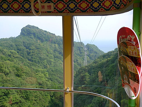 1065m長索道的纜車,一上車就有導遊小姐導覽介紹,乘客跟著她的介紹看上看下發出驚嘆的聲音,只有我們兩個傻子,完全狀況外,厲害的是她時間控制剛剛好,一抵達終點,正好也介紹完畢。從說明簡介中的漢字猜出這裏是海底隆起,經年累月的侵蝕作用留下堅硬的部份,現在孤立的山頭,從前和日本平是相連的。