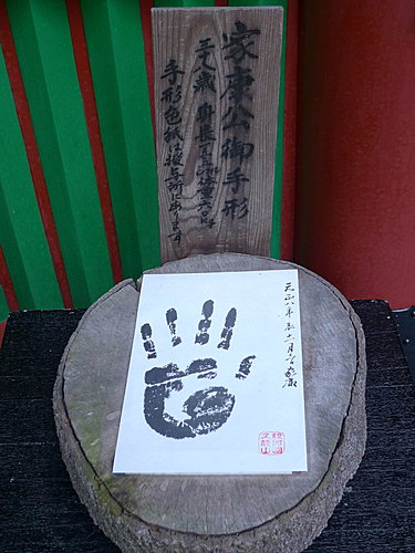山門:看到兩隻狛犬,一般都是向外,這裡的卻是向內,原因不明。狛犬前面拓著家康公的手印,據說他是斷掌,理智線和情感線交錯,所以在任何情況下都能理性面對問題。