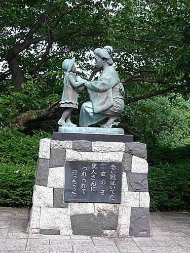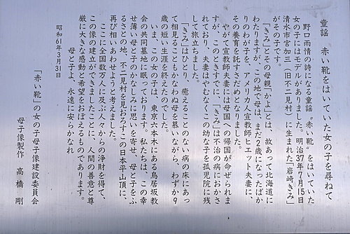 沿著步道,到達山頂前看到紅鞋母子像,似乎和日本童謠有關,可惜我們看不懂簡介內容。有很多遊客在此合影留念。
