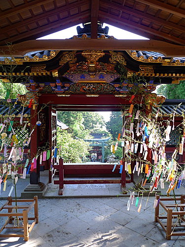 華麗的唐門,屋簷下用許多漆上金箔的木條,和細微的雕刻裝飾著。七夕將近,可以看到竹子上綁著一張張的願望。