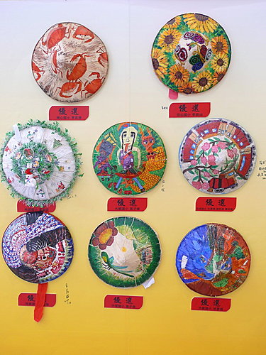我們要照的不是精品店,而是上面成排的彩繪斗笠,小學生的創意頗有意思。