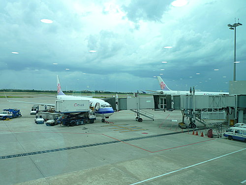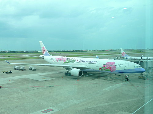 只好到處閒逛看飛機,發現一架畫有蝴蝶蘭的華航班機,興奮的猜想:我們等一下要搭的就是這台嗎?