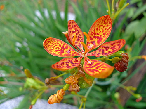 回家之後,順便到我們社區活動中心旁的"情人步道"散散步。"軟枝黃蟬"開得有點囂張;鼻頭角遇見的"射干"竟然自家後院就有了。