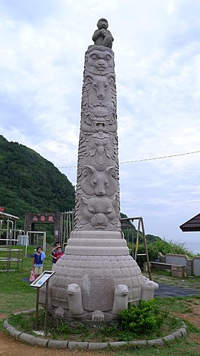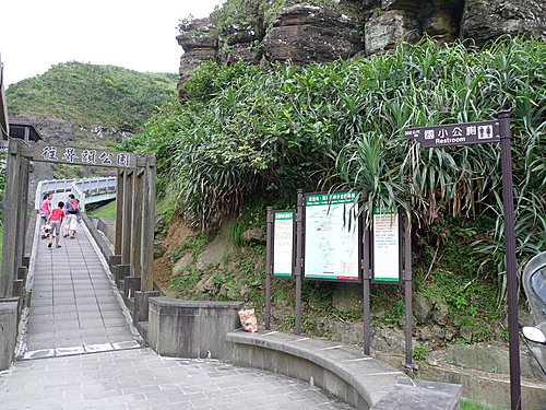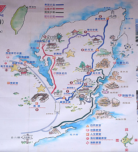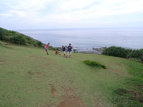 過了操場,豎立著一座頗為壯觀的"百獸圖騰",只是不大能理解立在這裡有何用意。其後是"太平洋鞦韆",小朋友盪著鞦韆,望著太平洋,這種童年應該很特別,當然,二姐家的兩個小朋友當然不會放過這個體驗的好機會(喆喆玩到把水瓶忘在這裡了)。出了山海觀也就出了鼻頭國小,正式走在鼻頭步道上。