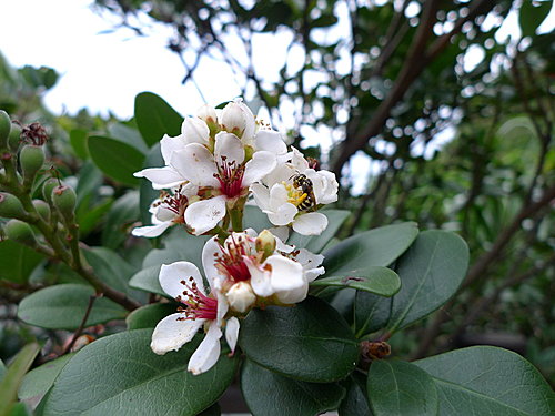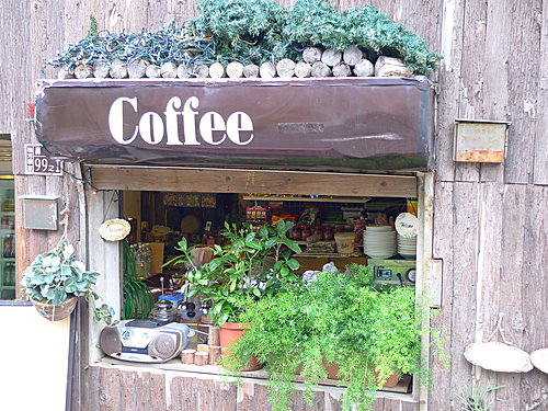 燈塔小舖,看起來是由民宅改建而成,原木的外牆,頗有味道;由店內不斷傳出陣陣的咖啡香,架上剛出爐的起司蛋糕,若能悠閒的坐在戶外,應該蠻享受的吧!附近種植的"厚葉石斑木",四、五月花期已過,所以只見得零星的花朵。