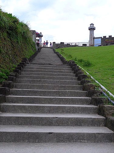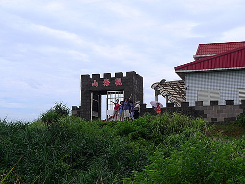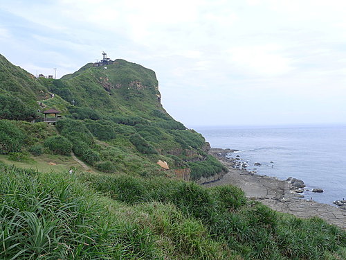 繼續往前走,又再看到山崖下的海蝕地形,以及前方的海天亭與山頭的軍營。