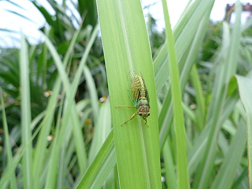 芒草叢中傳來陣陣的蟬鳴,一番尋找,原來是"草蟬"正在發出夏天的消息。而"台灣波紋蛇目蝶"也來湊熱鬧,查閱圖鑑,台灣有十種波紋蛇目蝶,分辨的重點除了依體型大小與海拔分布判別之外(台灣波紋蛇目蝶為低海拔常見種、展翅約3.5~4.0公分),牠的下翅腹面有三枚眼紋是分辨的重點(所以連上翅腹面共有四枚眼紋)。