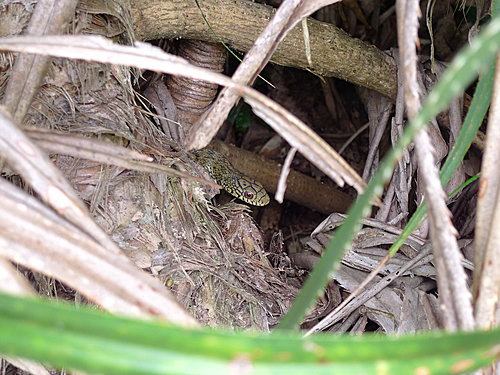 步道兩旁開始出現越來越多的林投樹林,而經由老婆大人的慧眼,發現了蛇的蹤跡(融融也許因為天氣太過悶熱,忙於拭汗喝水,發現小動物的能力大減),對照圖鑑,牠的名字叫"臭青公",台灣常見的無毒大型蛇類,最喜歡在住家附近的洞穴或岩縫中居住。