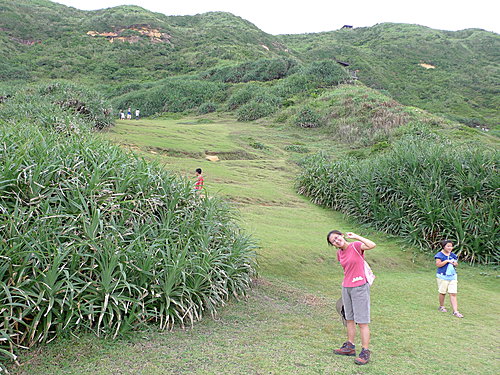 順著望月坡上小徑行走,沒想到路徑越走越窄、越走越陡,而且要穿過刺人的林投樹與割人的芒草,一行人陸續掛彩,終於有驚無險的"爬"到海天亭,而提議走這條小徑的本人也不免遭眾人抱怨一番。