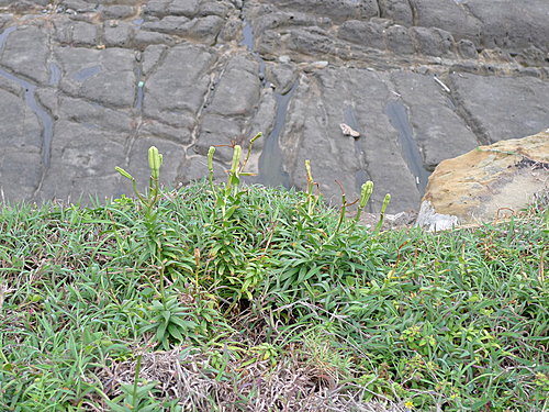 望月坡上可以更清楚地俯瞰海蝕地形。崖邊生長著一叢含苞未放的百合花。