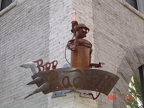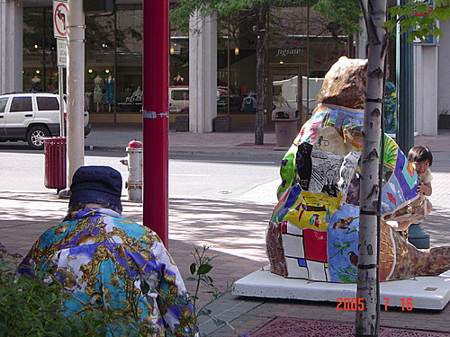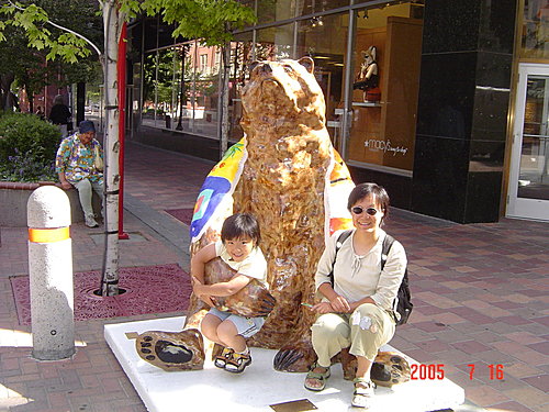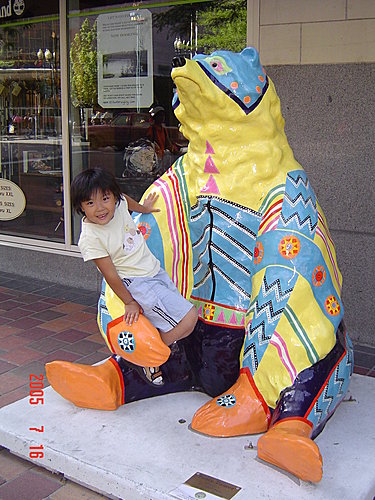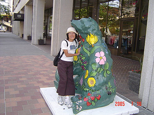 Main Street主街的四個街角各有一隻彩繪熊:第一張照片很有趣,我們本來還以為有兩隻彩繪熊,仔細一看,發現後面較小的一隻其實是一位老太太坐在花台上,還好她聽不懂中文,不然還真是尷尬
