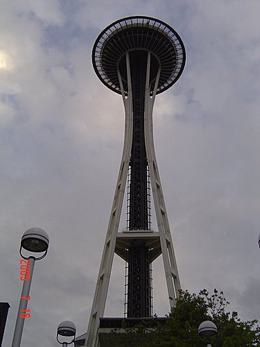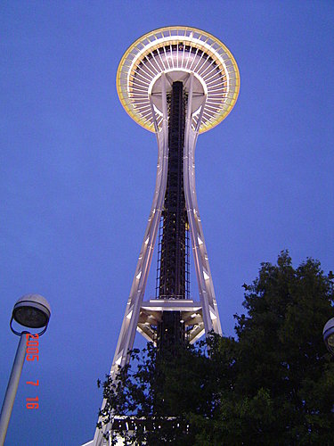 Space Noodle針塔:一張是上塔前所照,一張是下來時拍攝的,還是夜景比較美。這裡是西雅圖的地標,造型像是一個飛碟立在細細長長的金屬上。當初為了舉辦萬國博覽會而倉促興建,九個月就完工。搭電梯到頂只需40秒鐘。