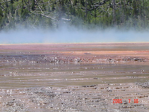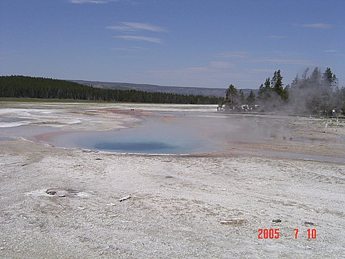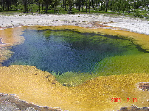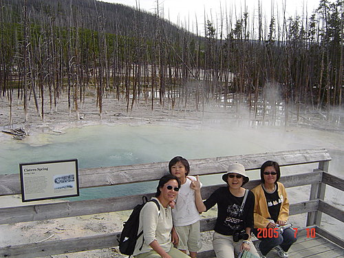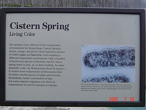 Cistern Spring 貯水槽溫泉:系統和蒸汽船是相連的,所以只要蒸汽船一噴發,這一池就會乾涸。看板上特別說這裡溢流的河床上生長著一些藻類、細菌,改變了水的顏色,所以是"Living Color活色彩",其中由某些細菌中萃取出的酵素可供測試指紋DNA和愛滋病毒。(應該還有許多科學上的用途吧!)