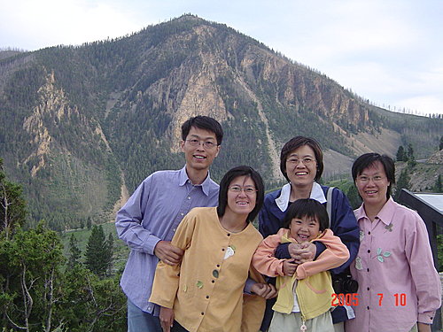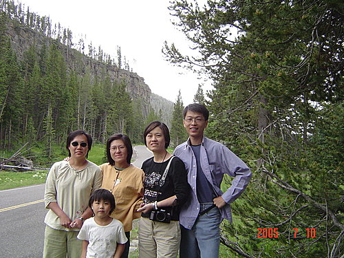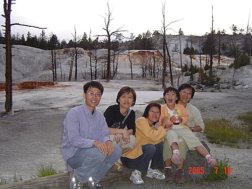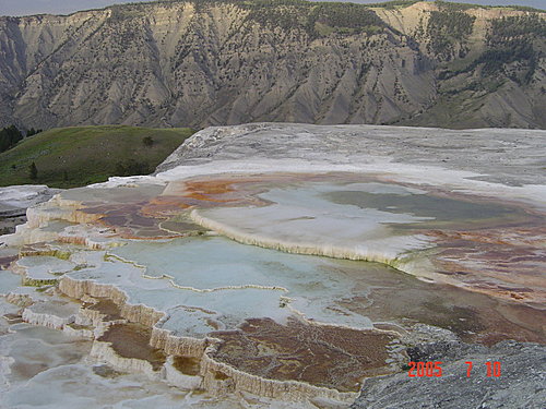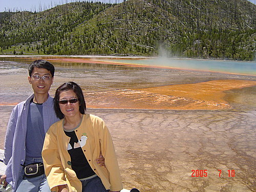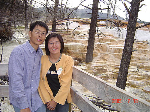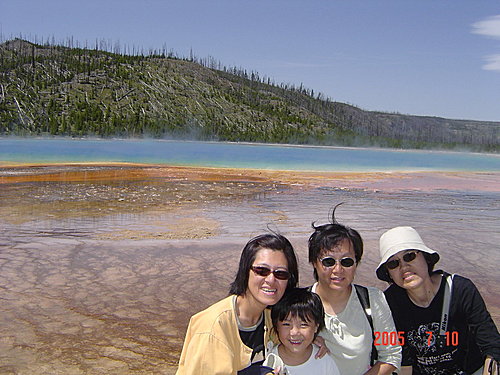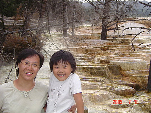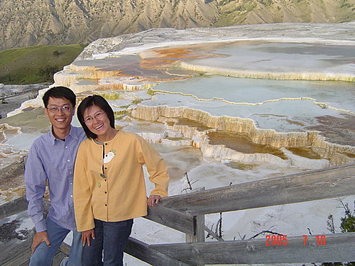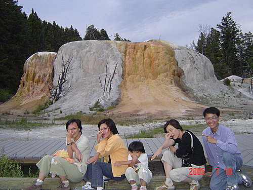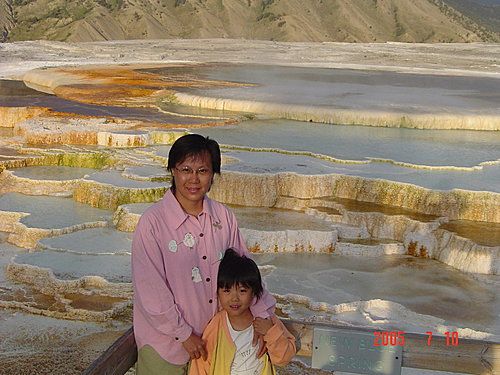 New Blue Spring:我們覺得整個黃石中最美的溫泉非它莫屬,是典型的階梯形溫泉,解說上說它時而活躍,時而死寂,一年內會有多次改變。幸運的我們看到的一定是最活躍的時候,才會如此典雅、秀麗。