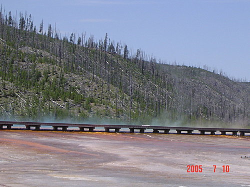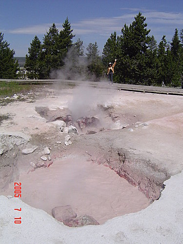 這一區最有名的就是Steamboat Geyser蒸汽船噴泉,它是世界最高的活溫泉,水柱可高達90公尺,光是噴完後的蒸氣聲就可以轟隆隆地響個好幾小時,可見能量有多大。可惜我們看到時動靜不大,只好拍下它的看板想像它的威力。