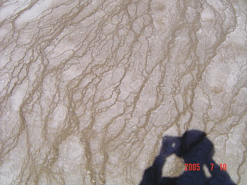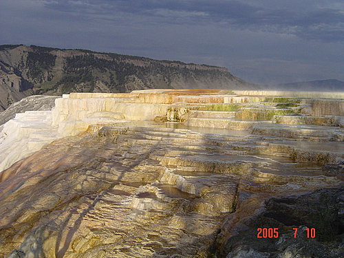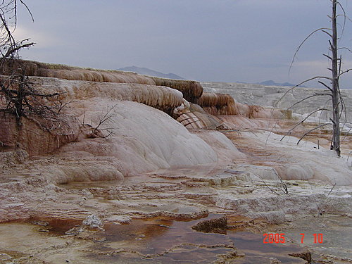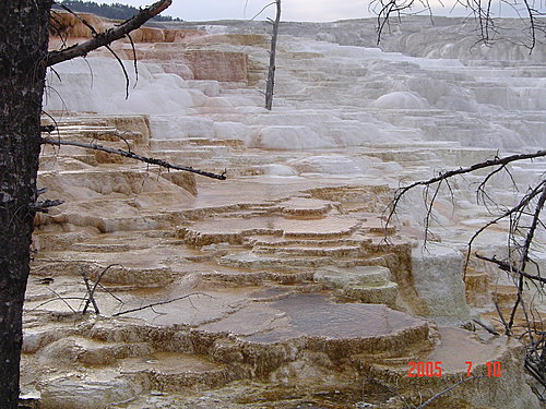Mammoth Hot Spring Trail史前巨象溫泉區:這裡是由許多高台形成的階梯狀溫泉,很漂亮,和之前幾區的型態和美感都不同。大量的石灰隨著泉水沉積,形成黃、褐、白的不同顏色的花紋,在陽光照射下非常漂亮。