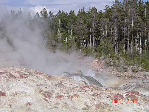 下一站是Norris Geyser Basin諾里斯溫泉流域:大多數的溫泉都是鹼性的,可是諾里斯溫泉卻是酸性的。地下的酸性氣體會使石頭溶解,變成泥漿,是這一區的特色,入口設有展示館。