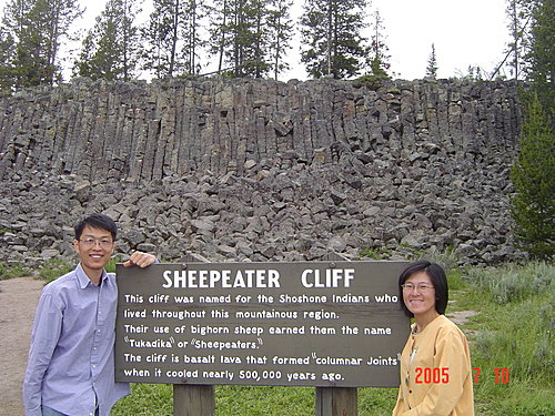 Sheepeater Cliff食羊者懸崖:"Sheepeater"是印地安休熊族的一支,是此地目前的佔領者,所以才有這個名字。這片懸崖不高也不大,但是柱狀的玄武岩非常特別,讓我想起澎湖的小島,和北海道的層雲峽。
