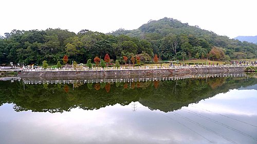七點半就到了慈湖,大門還未開,先到牛角湳埤欣賞水中倒影,對面是慈湖紀念雕塑公園,裡面陳列許多蔣公的銅像。
