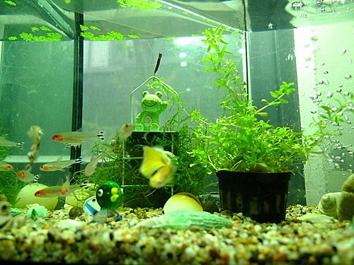 有魚當然要有蝦,二姐本想找我們到溪邊撈蝦,但我覺得野生蝦養在魚缸裡總是不太恰當,於是乎向有養水族箱的同事要了一些黑殼蝦,好心的同事還附送了水草、浮萍、蘋果螺,今天花一點時間把水族箱內安排一下,整個水族箱頓時熱鬧起來。